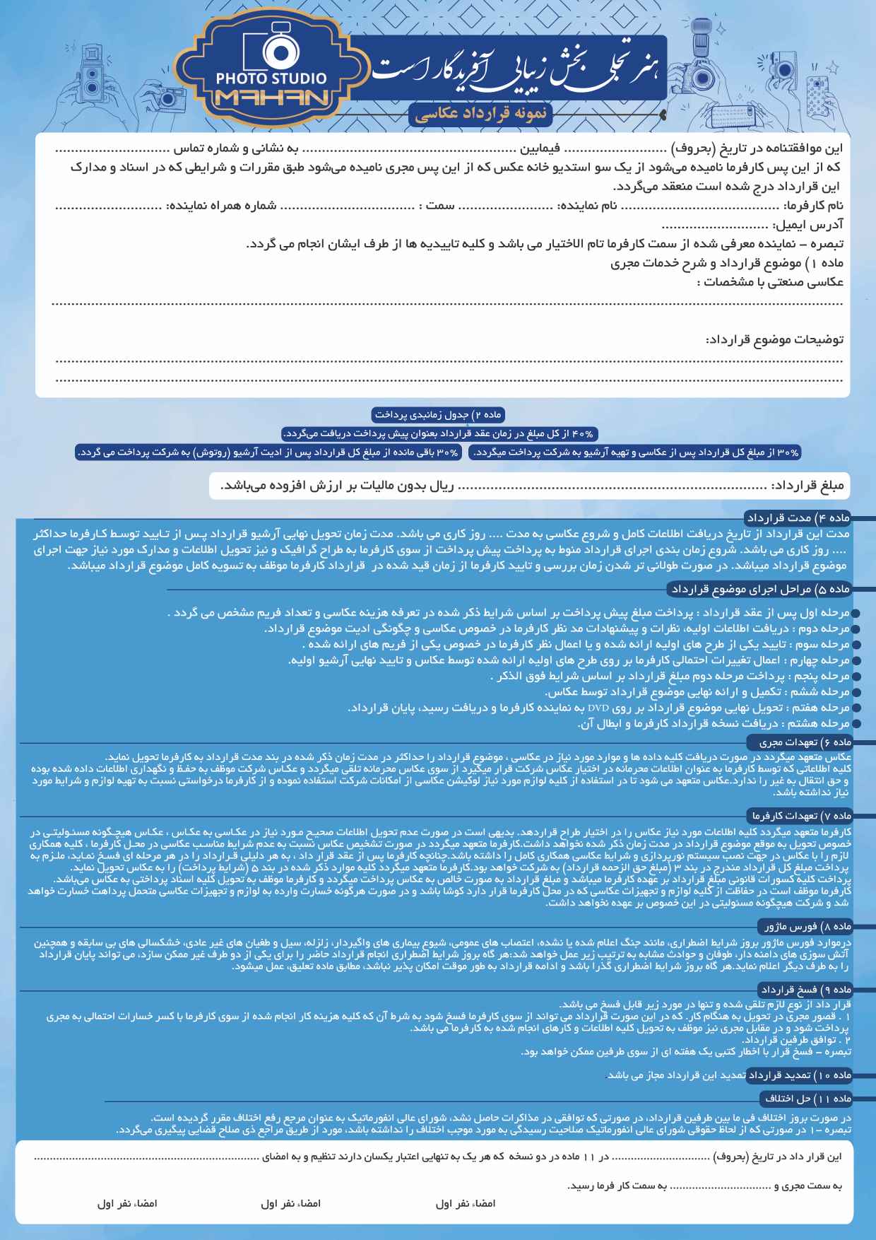 طراحی رسمی و فارسی مخصوص قراردادهای عکاسی